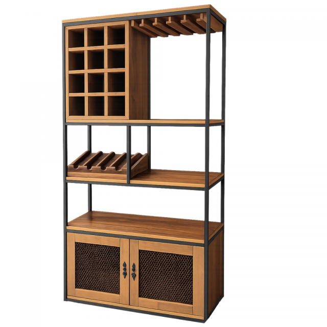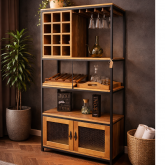 Adega em estilo industrial que combina madeira natural e estrutura metálica, unindo funcionalidade e design. Possui nichos para garrafas, suporte para taças, prateleiras versáteis e armário inferior com portas em tela metálica, ideal para organizar e valorizar ambientes gourmet, salas de jantar ou espaços de convivência com elegância e personalidade.